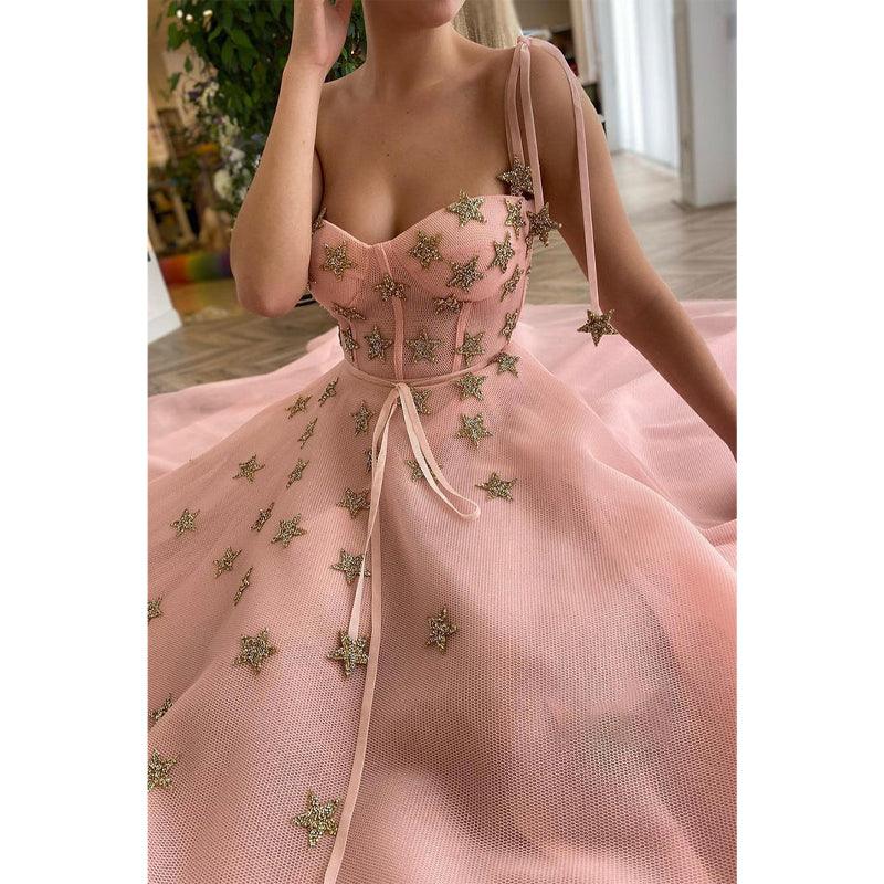 Vestido de fiesta de tul rosa con escote en forma de A y bolsillos