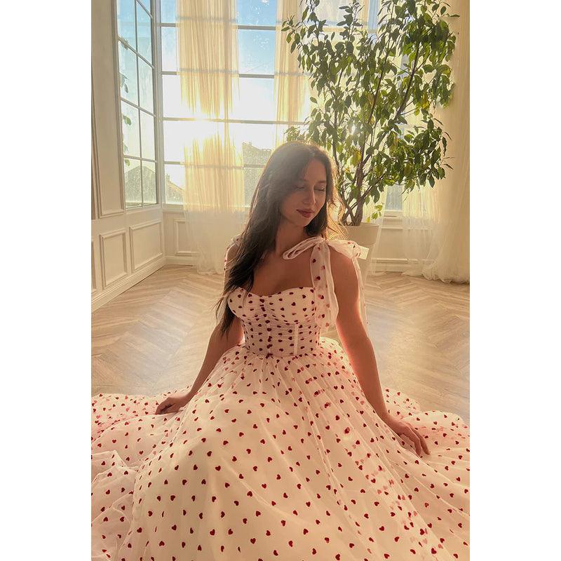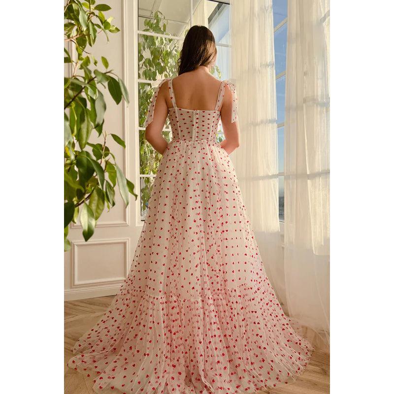 Vestido de fiesta largo de tul fruncido con escote en A y ramo de corazones