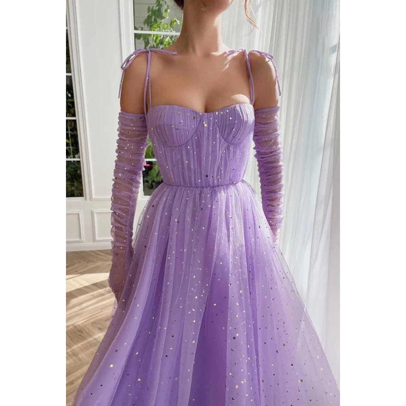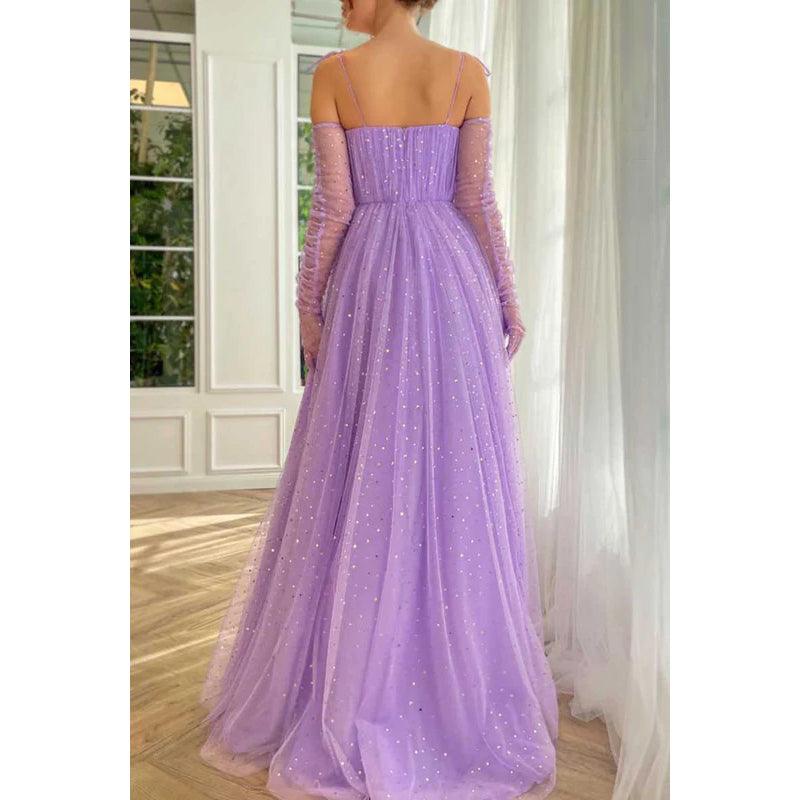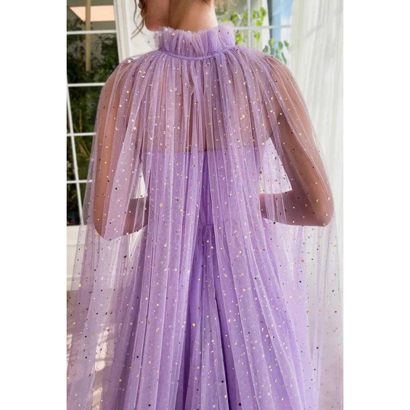 Vestido de fiesta largo de tul con escote en forma de A y tirantes finos con chal