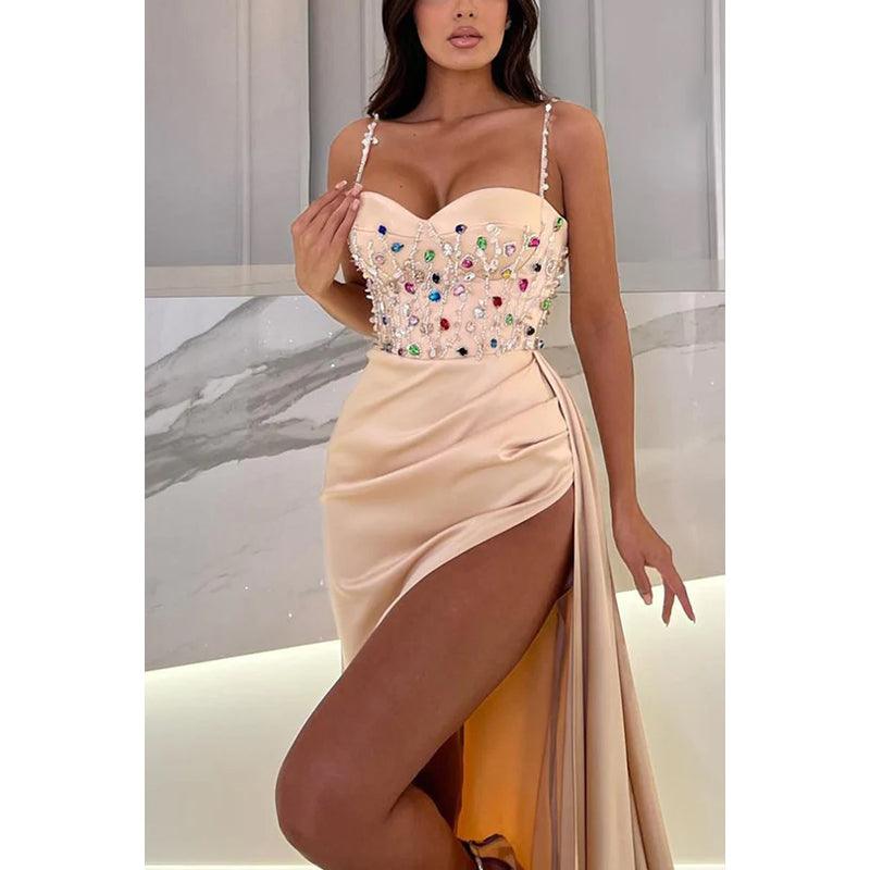 Vestido de noche de satén fruncido con cuentas y tirantes finos en forma de corazón