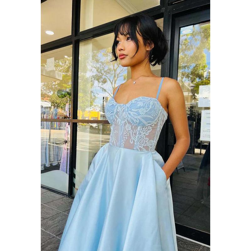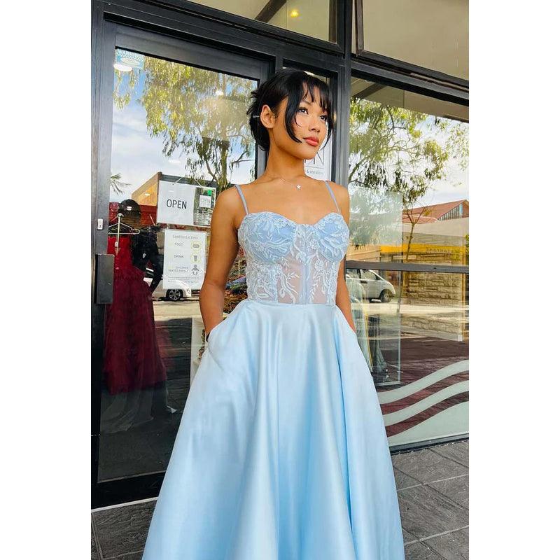 Vestido de fiesta de corte A con escote en forma de corazón, tirantes finos y apliques de encaje