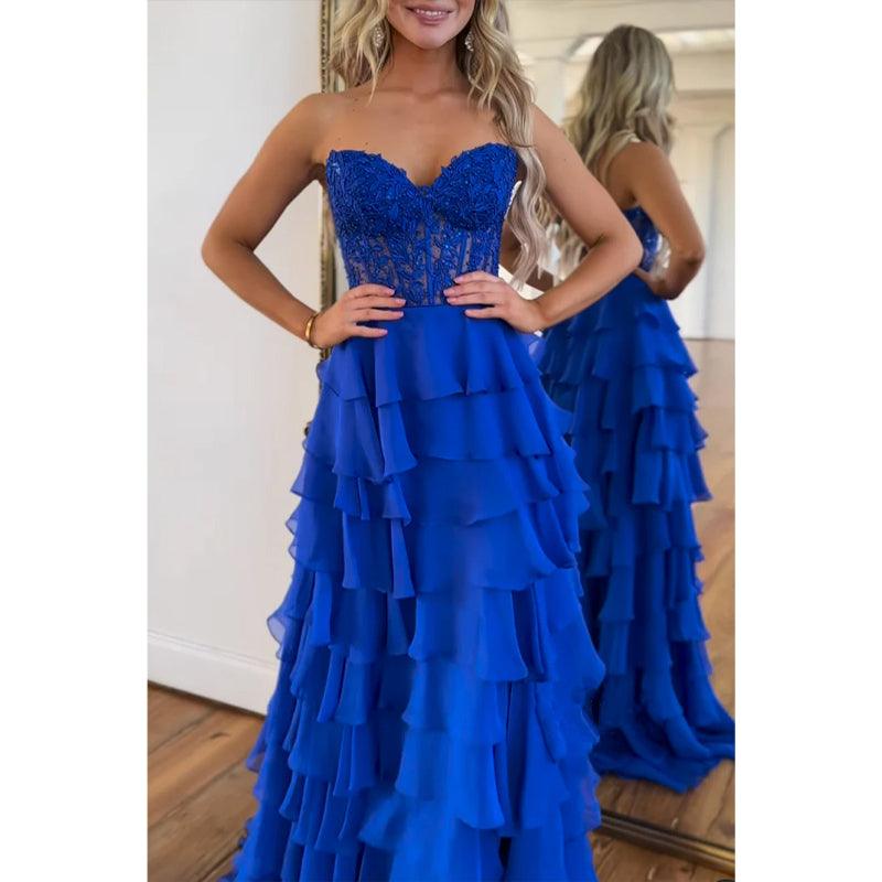 Vestido de noche de fiesta con escote en forma de A, sin tirantes y apliques en capas