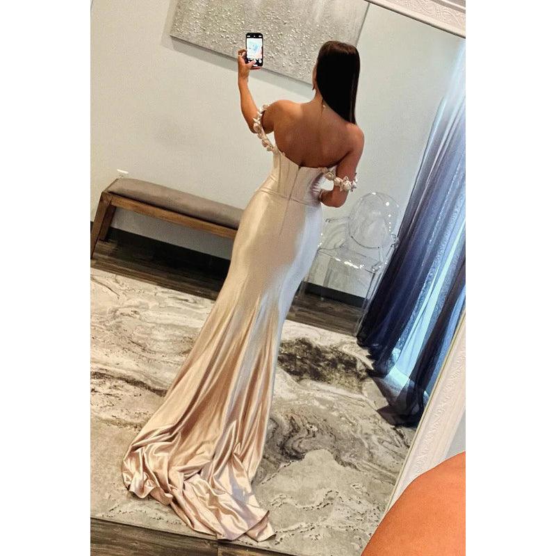 Vestido de fiesta de satén elegante clásico de corte trompeta/sirena con hombros descubiertos y mangas casquillo