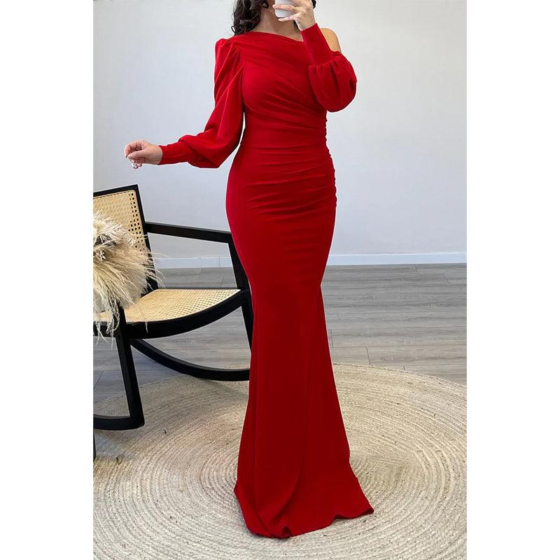 Vestido formal de fiesta de manga larga con pliegues y un hombro al aire, corte trompeta/sirena