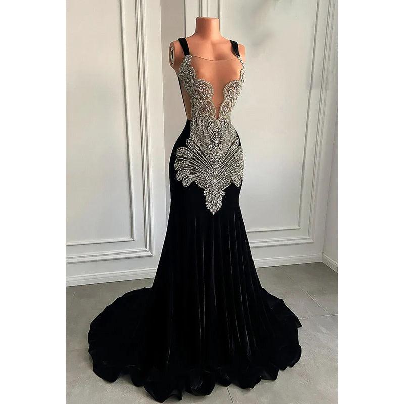 Vestido de fiesta de noche con escote en V, tirantes finos, volantes y pedrería, corte sirena/trompeta