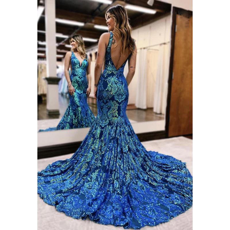 Vestido de fiesta de graduación con escote en V, lentejuelas y espalda descubierta, lujoso, con volantes y corte trompeta/sirena