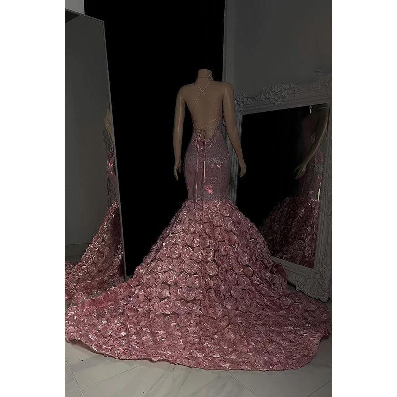 Vestido de fiesta sin mangas con espalda descubierta, encaje floral y lentejuelas con tirantes de trompeta/sirena