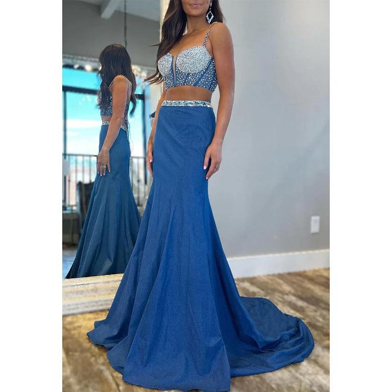 Vestido de fiesta de graduación de dos piezas con tirantes finos y cola, con cuentas