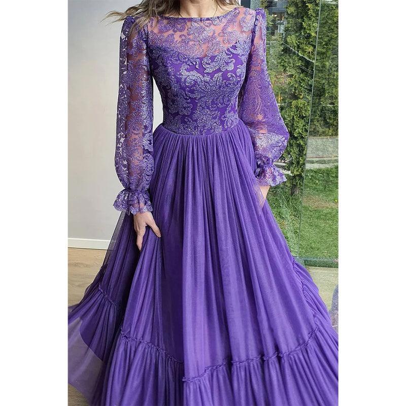 Vestido de noche formal de corte A con mangas largas y encaje redondo único