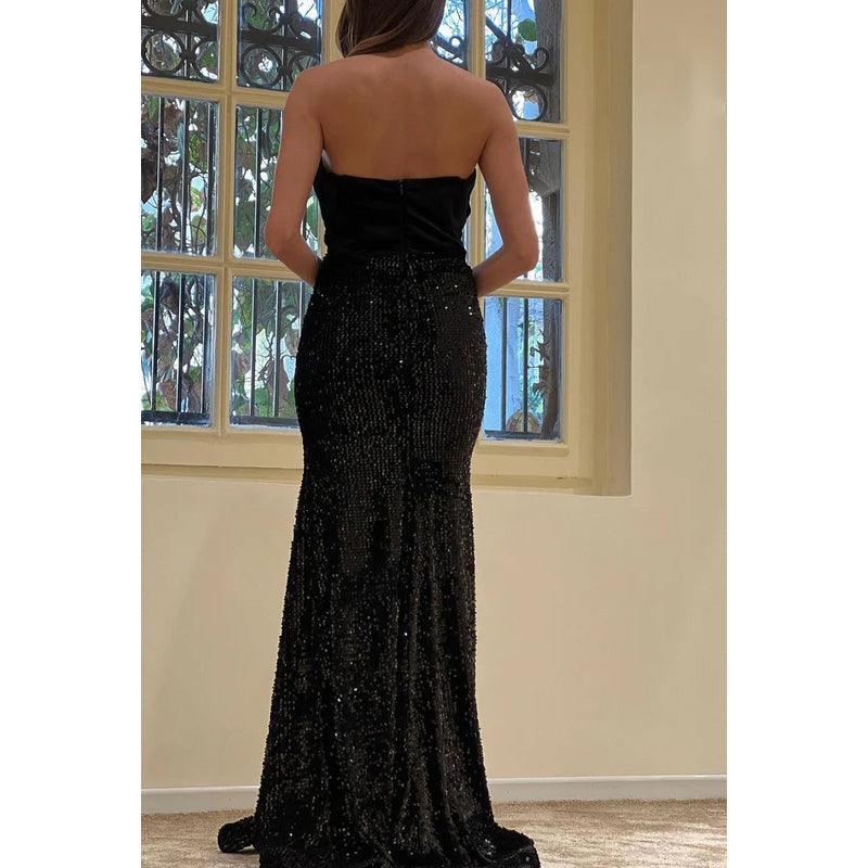 Vestido de noche largo de satén con lentejuelas fruncidas y escote en V sin tirantes para graduación