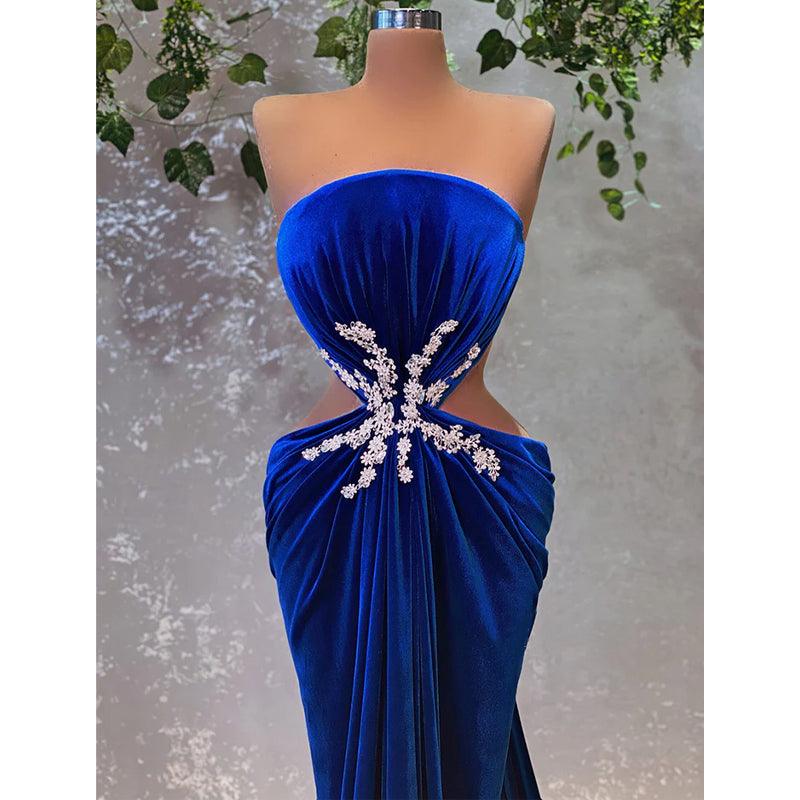 Vestido de fiesta largo azul real sin tirantes, de terciopelo con cuentas y abertura.