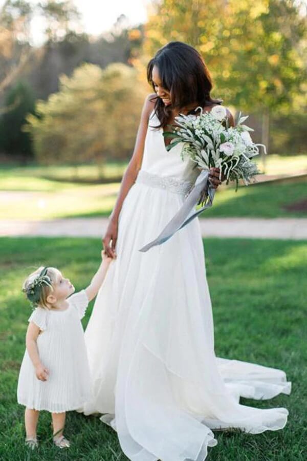 Vestidos de novia de gasa blanca, corte A, escote en V y cuentas. Vestidos de novia. MW702