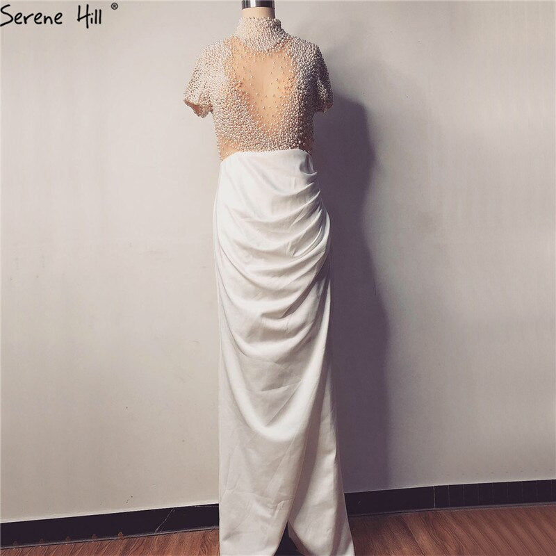 Vestidos de noche blancos de corte sirena, mangas cortas, diseño 2025, cuello alto, apliques de perlas, LA70207