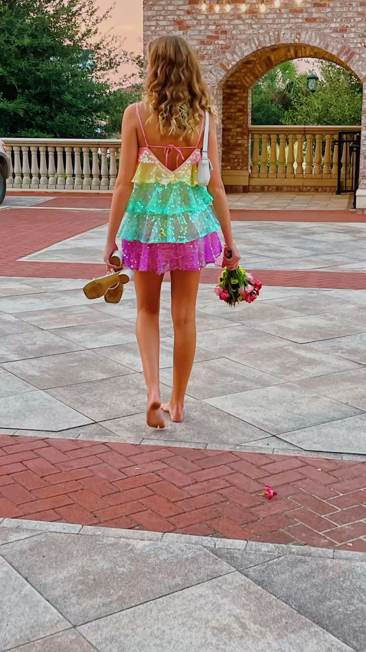 Vestido de fiesta de lentejuelas brillantes para mujer, sin mangas, con volantes arcoíris en capas, estilo arcoíris, ideal para fiestas y discotecas (Y2475)