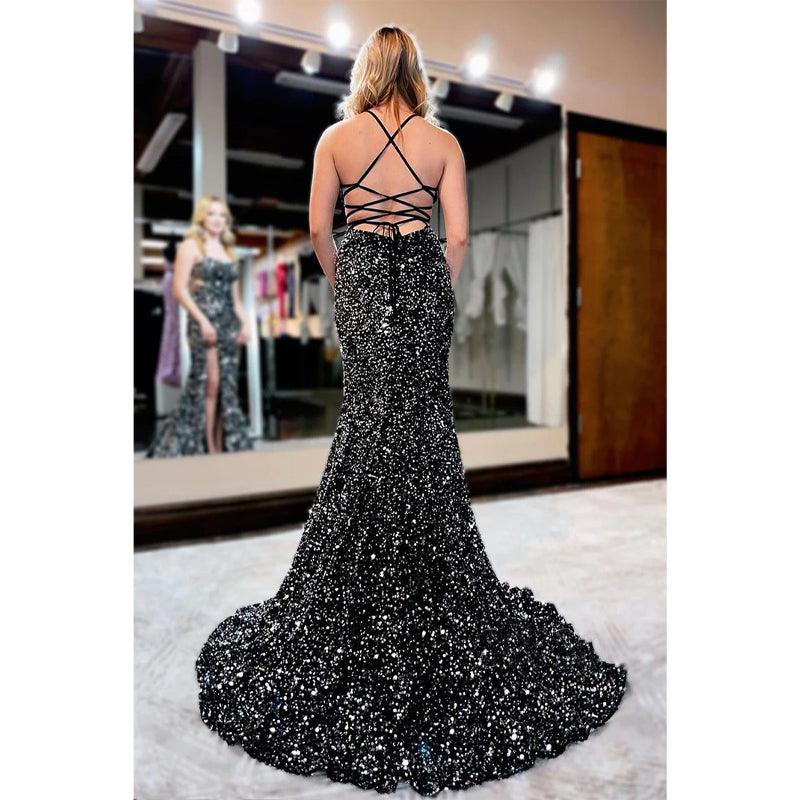 Vestido de fiesta para mujer con tirantes finos, lentejuelas negras y brillantes