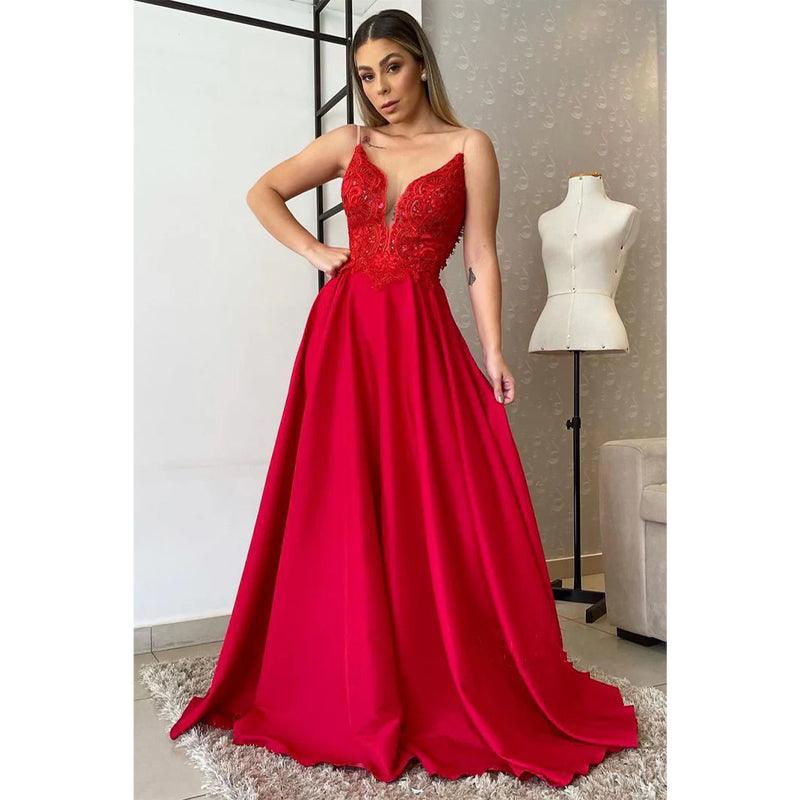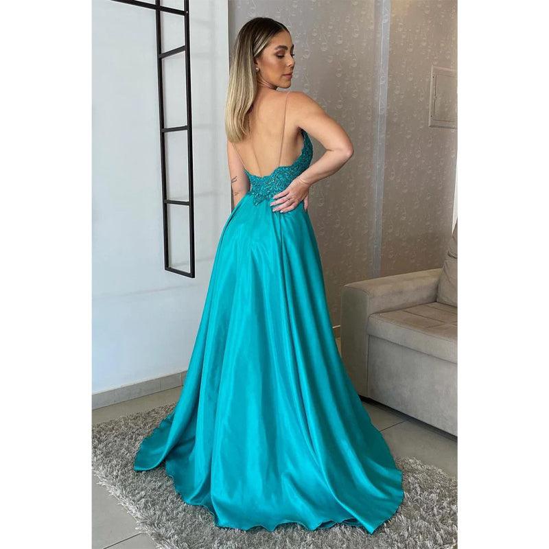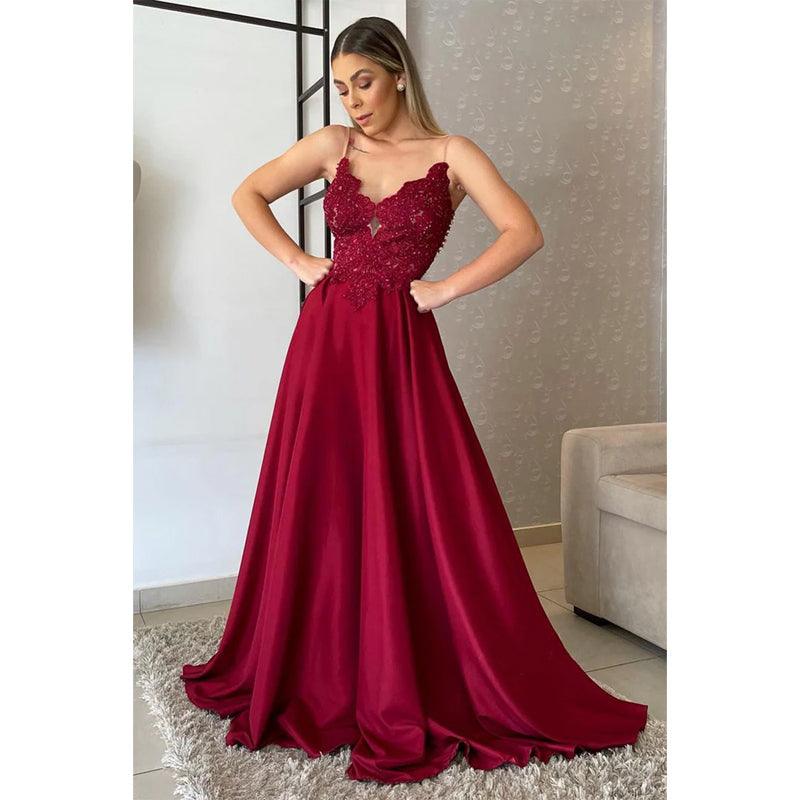 Vestido de noche formal largo con apliques de encaje y tirantes finos para mujer