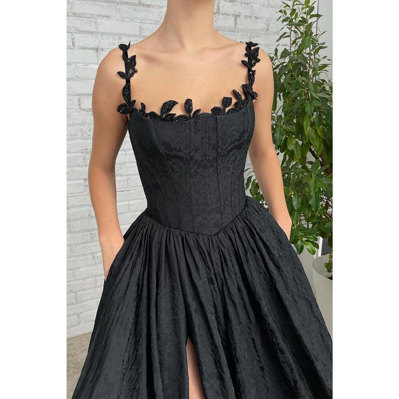 Vestido de fiesta largo con abertura y encaje negro cuadrado para mujer con bolsillos
