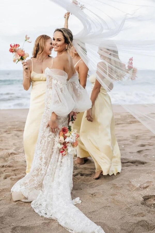 Haz que tu día especial sea aún más especial con este elegante vestido de novia de encaje color marfil con corte sirena. Con un escote impactante y una falda de estilo bohemio, este exquisito vestido de novia para bodas en la playa sin duda...