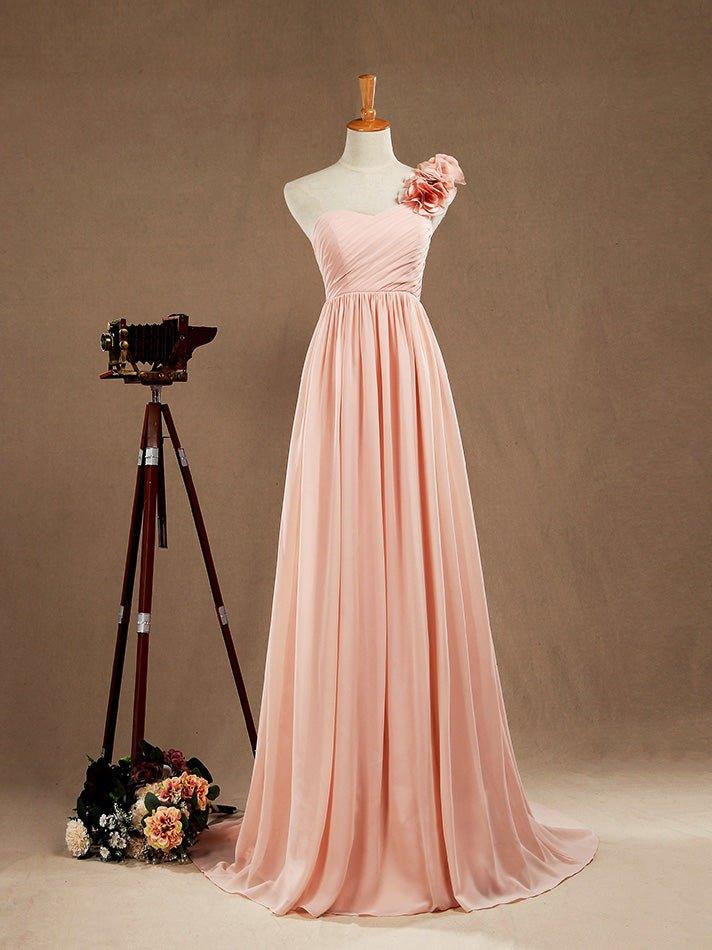 1. Informations sur l'article : Robe de demoiselle d'honneur longue en mousseline de soie sur commande, coupe trapèze, une bretelle fleurie, décolleté en cœur.