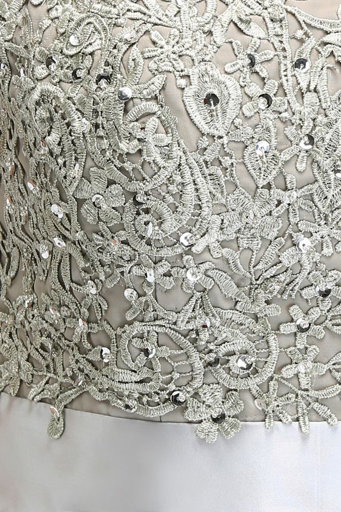 Robe de soirée argentée à manches courtes et décolleté trapèze, ornée d'appliques et d'une ceinture, longueur au sol.