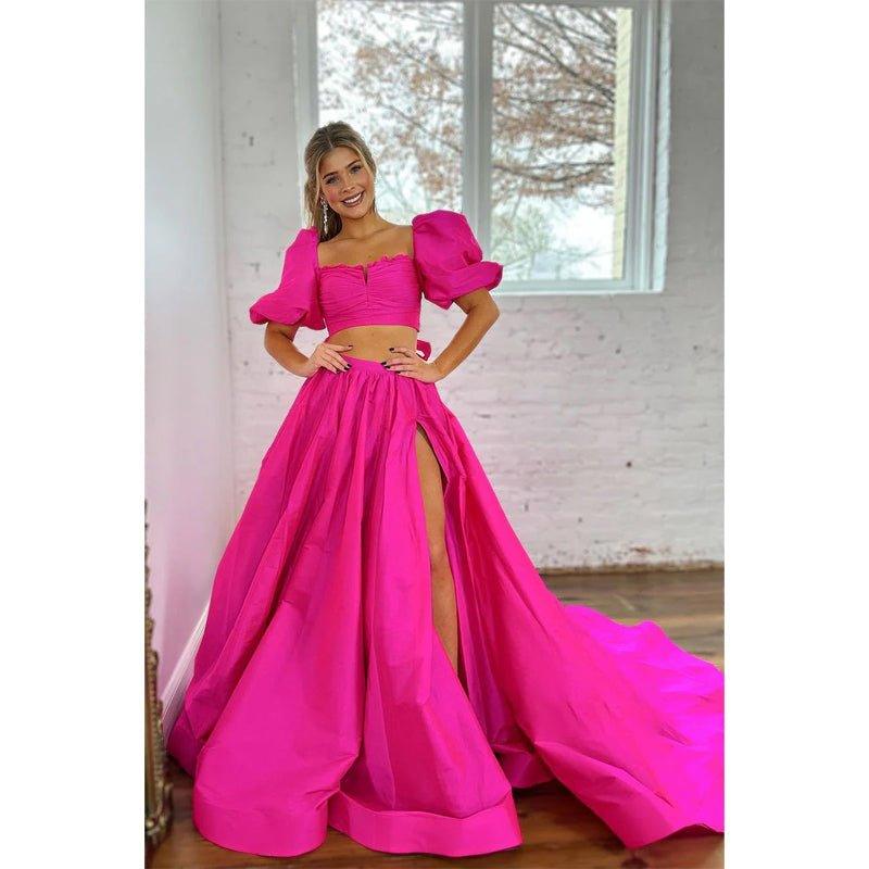Robe de bal longue rose en deux pièces, coupe trapèze, avec nœud papillon carré et fente