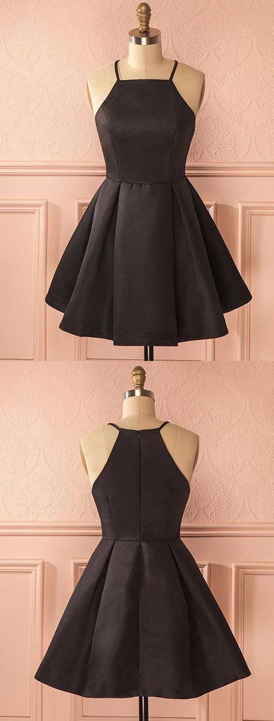 Robe de bal courte noire en satin, coupe trapèze, col carré et plis, modèle S414