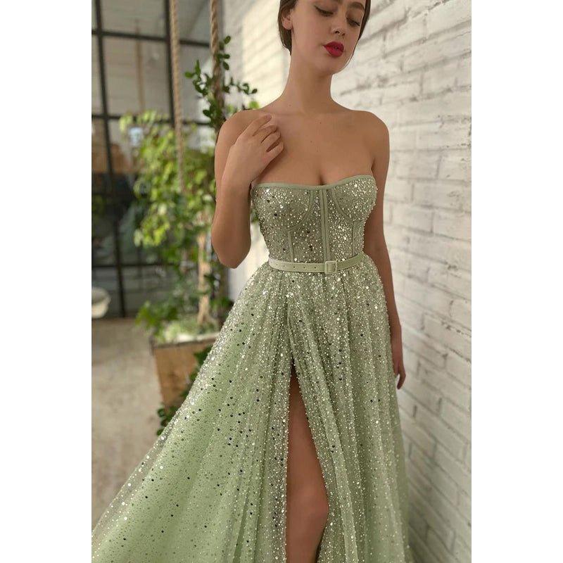 Robe de soirée trapèze sans bretelles, fendue et pailletée, sans manches