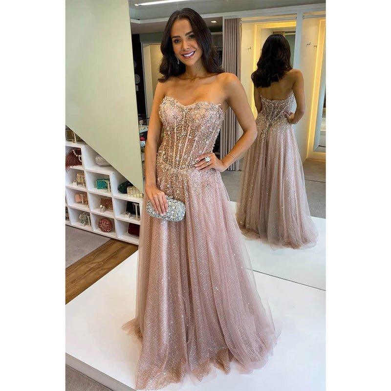 Robe de soirée longue trapèze en tulle et perles, décolleté en cœur