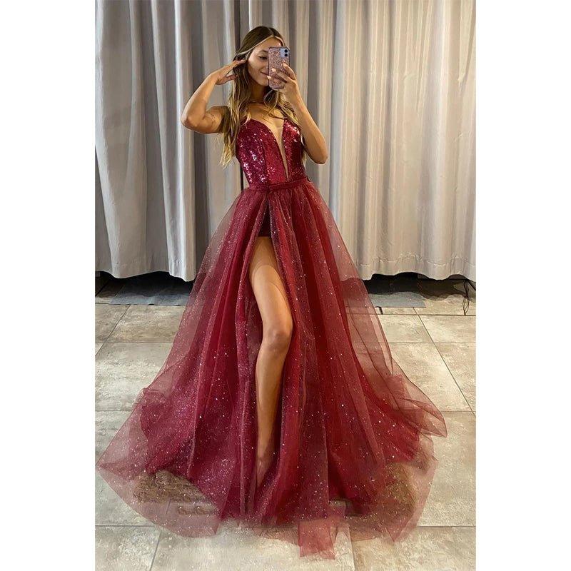 Robe de bal élégante à col en V profond et paillettes, jupe détachable