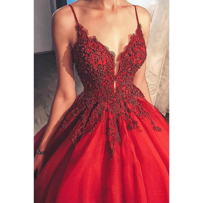 Robe de bal longue en tulle bordeaux à bretelles spaghetti et perles