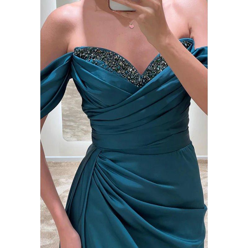 Robe de soirée longue en satin froncé à épaules dénudées et perles