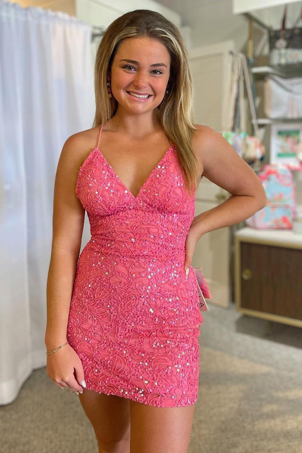 Robe courte moulante à fines bretelles et sequins roses, dos croisé, idéale pour un bal de promo.