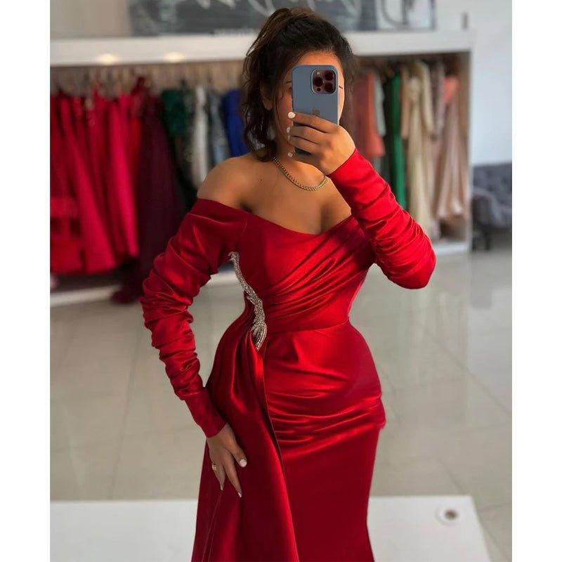 Robe longue de soirée chic et moderne en satin rouge à épaules dénudées et plis perlés avec superposition