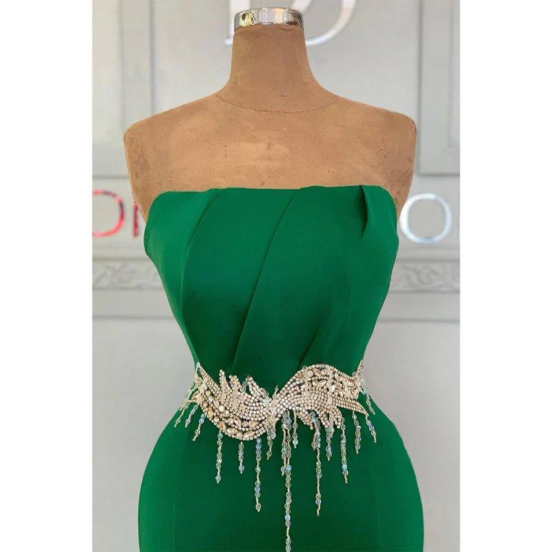 Robe de soirée longue sirène en satin vert plissé, sans bretelles et chic