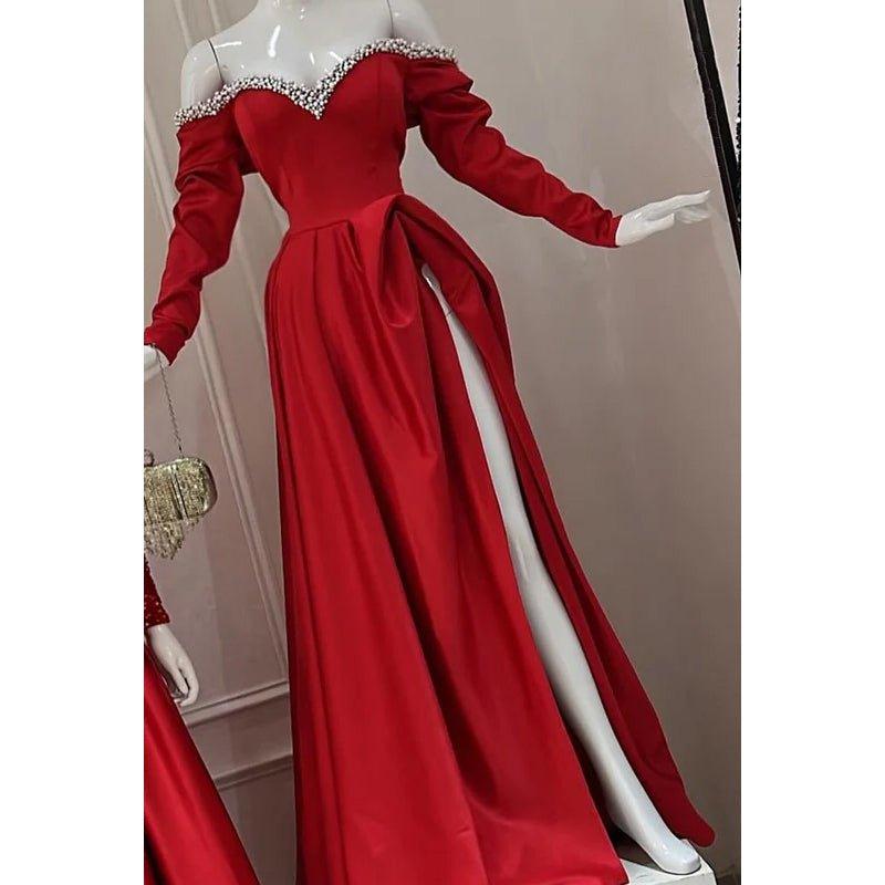 Robe de soirée trapèze classique et intemporelle, épaules dénudées, fente latérale, avec perles