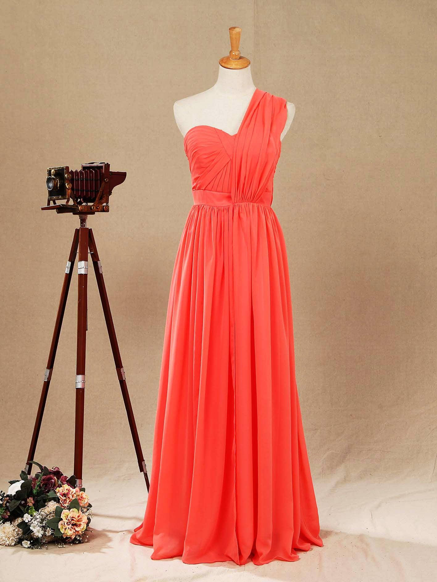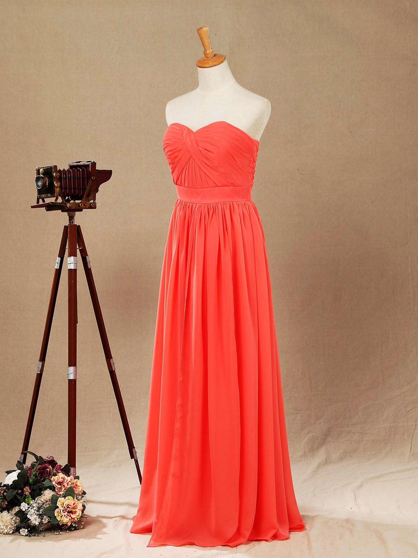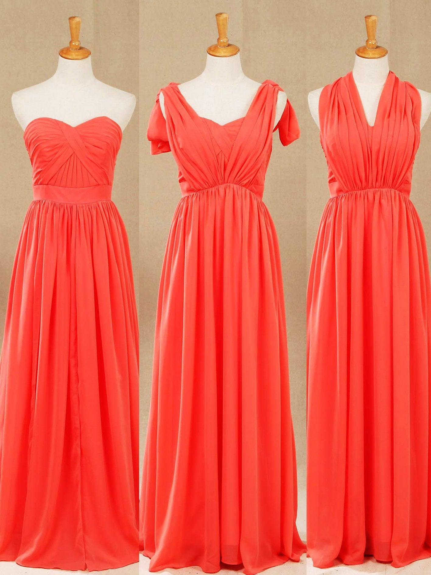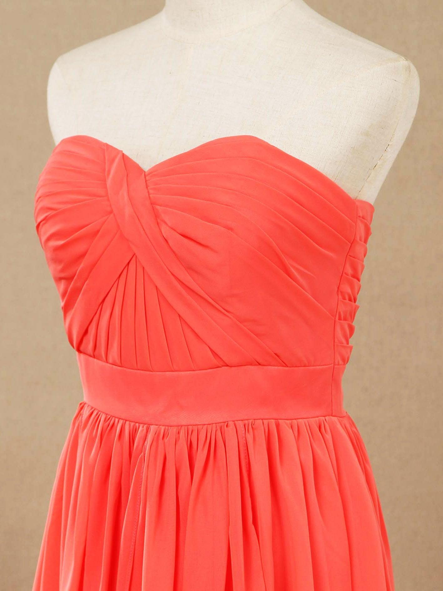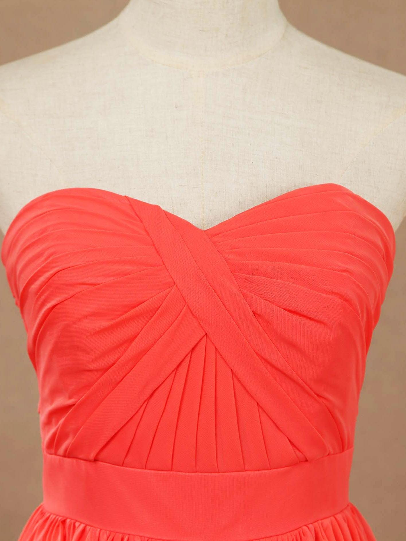 1. Informations sur l'article : Robe de demoiselle d'honneur convertible en mousseline de soie corail, coupe trapèze, asymétrique, col licou, sans bretelles, décolleté en cœur, sur commande.