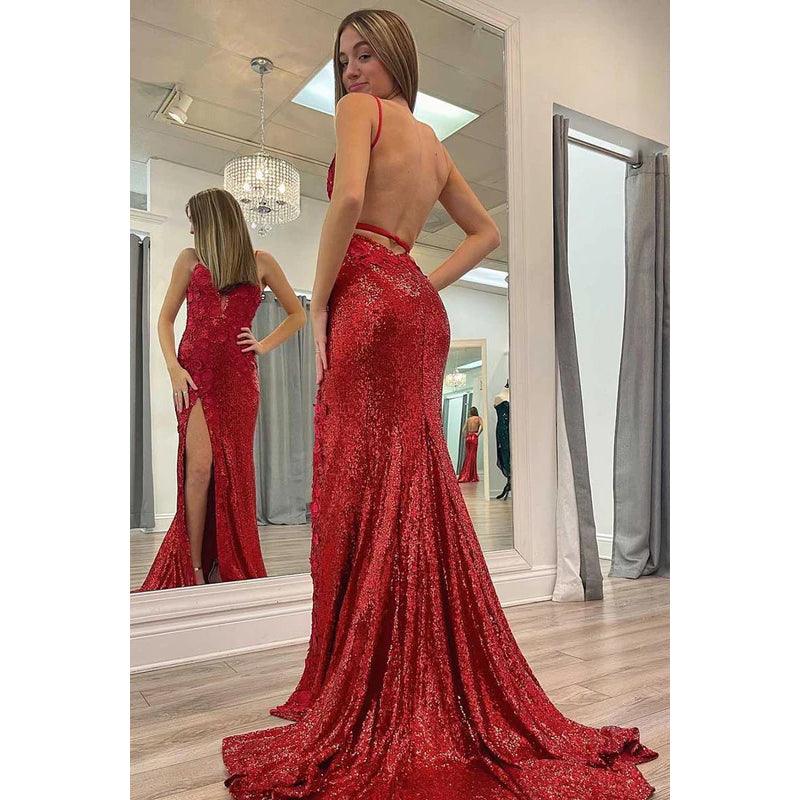 Robe de bal longue à bretelles spaghetti et décolleté en V profond, ornée de paillettes appliquées