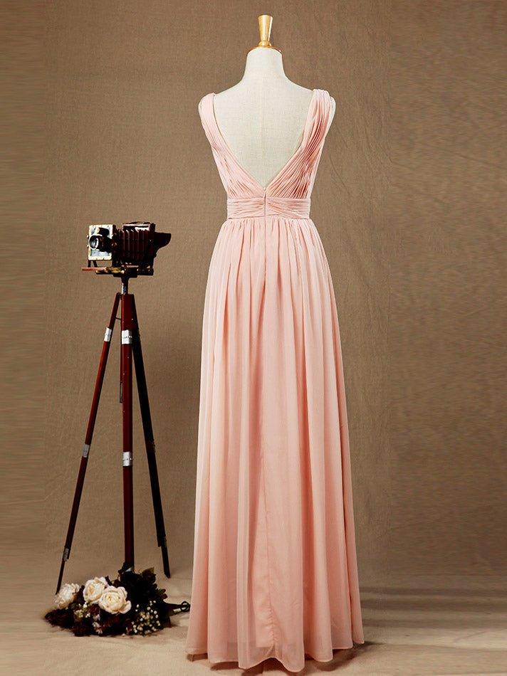 1. Informations sur l'article : Robe de demoiselle d'honneur en mousseline de soie, ligne A/princesse, doubles bretelles, décolleté en V profond, dos en V, longueur au sol, fabriquée sur commande.