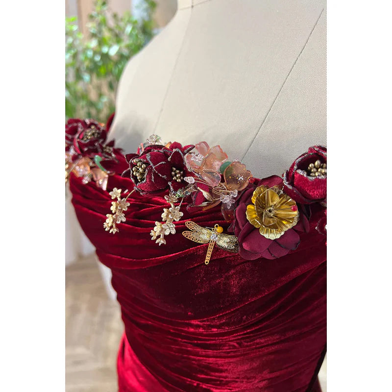 Robe de bal rouge élégante à épaules dénudées et manches longues, fendue et froncée, avec fleurs