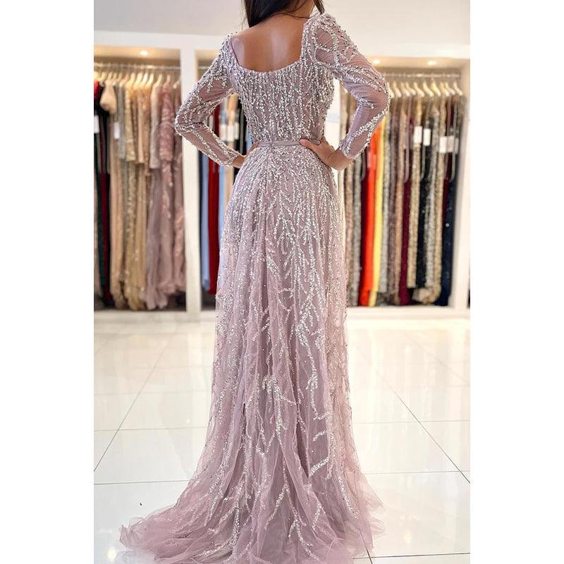 Robe de bal de fin d'année élégante, à manches longues, style sirène scintillante et spectaculaire, avec plumes