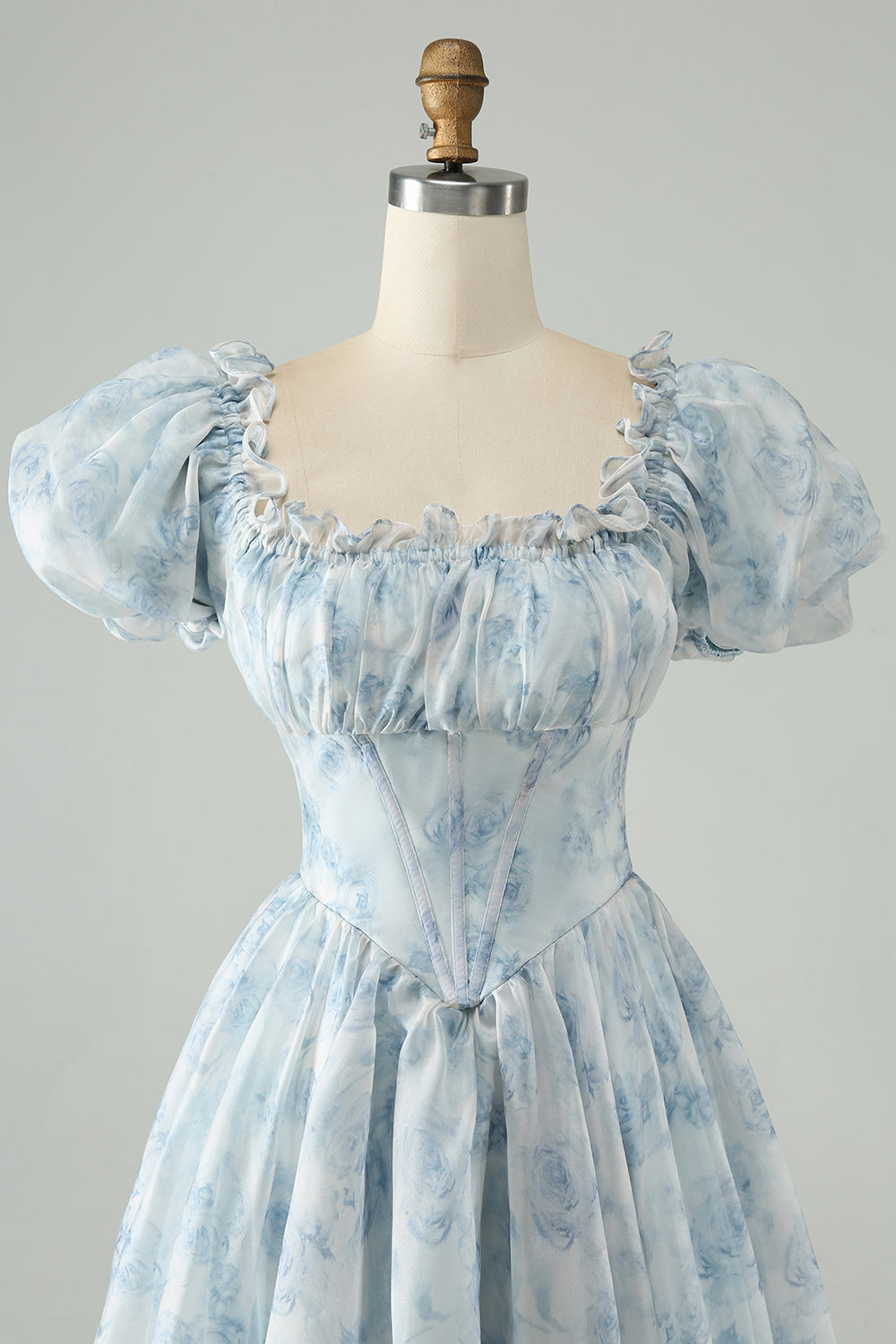 Robe courte de bal vert clair à col carré et imprimé floral, coupe trapèze et volants