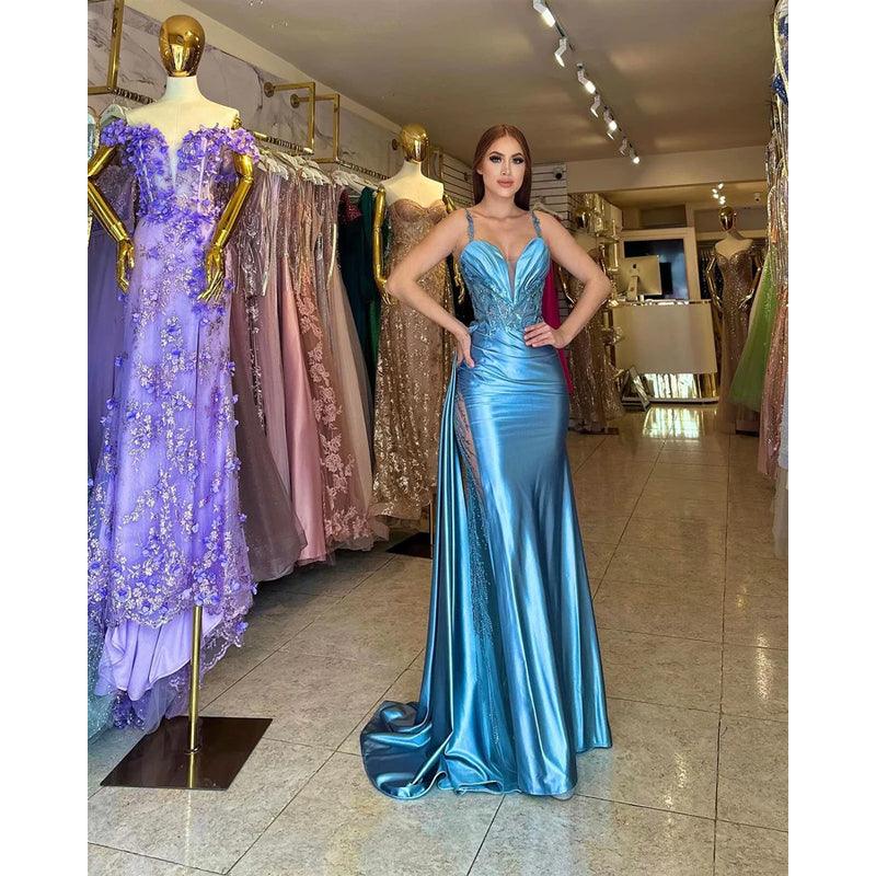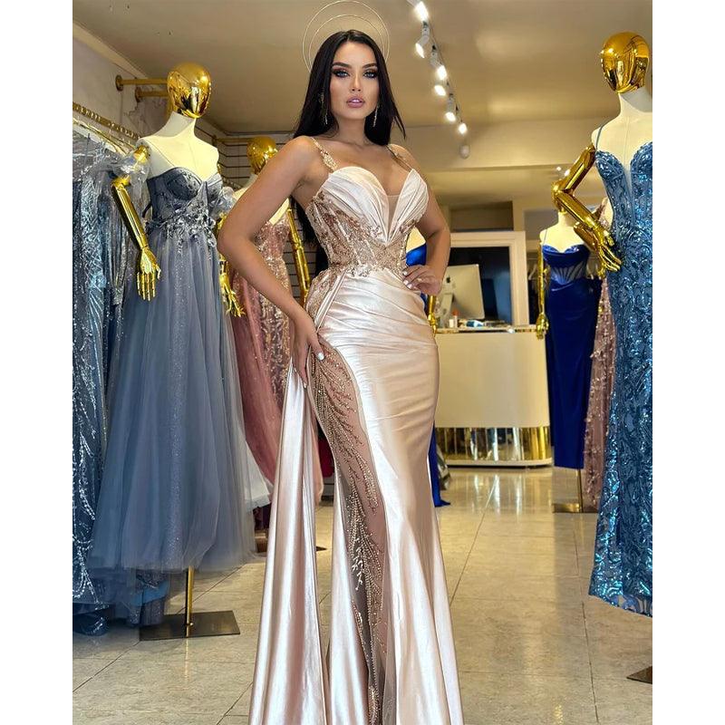Robe de bal longue fourreau en satin à paillettes et dentelle froncée