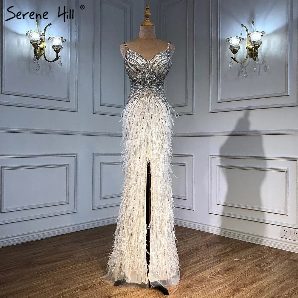 Robe de soirée sirène noire à bretelles spaghetti, fendue, plumes et perles, pour femme, tenue de mariage, 2025, LA70623