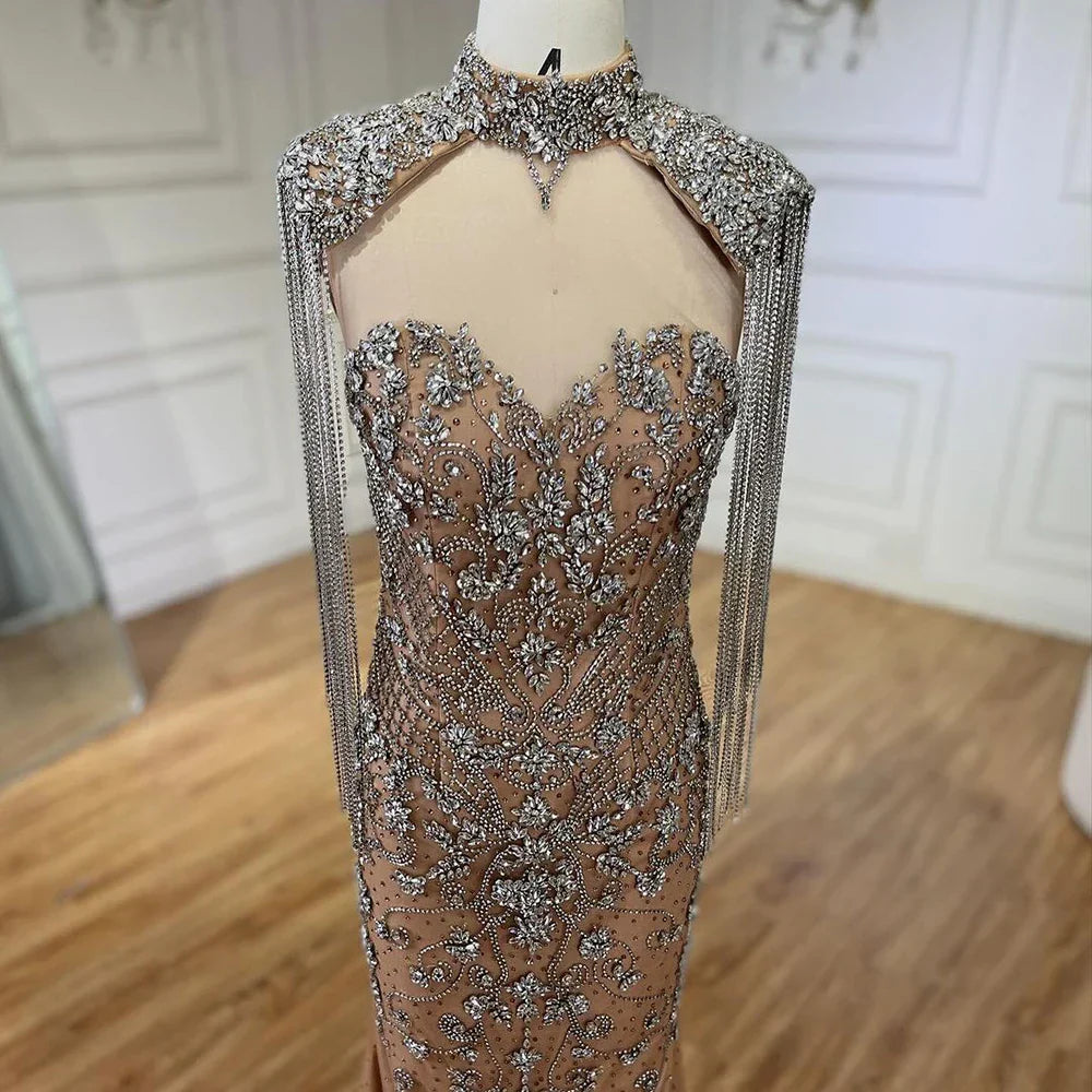 Robe de soirée sirène arabe caramel à franges et perles, luxueuse robe de soirée de Dubaï pour femmes, tenue de mariage, 2025 LA72237A