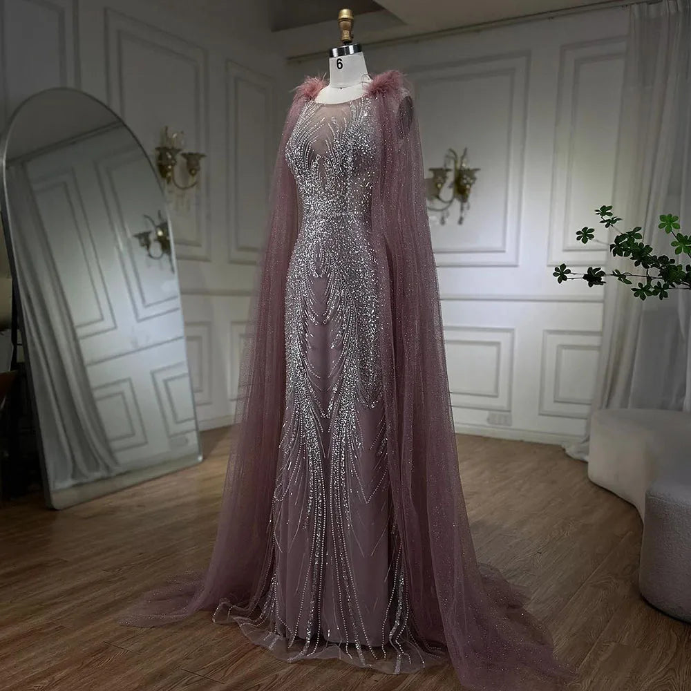 Robe de soirée sirène rose arabe avec plumes élégantes et luxueuses, manches cape perlées, pour soirée femme 2025 LA71709A