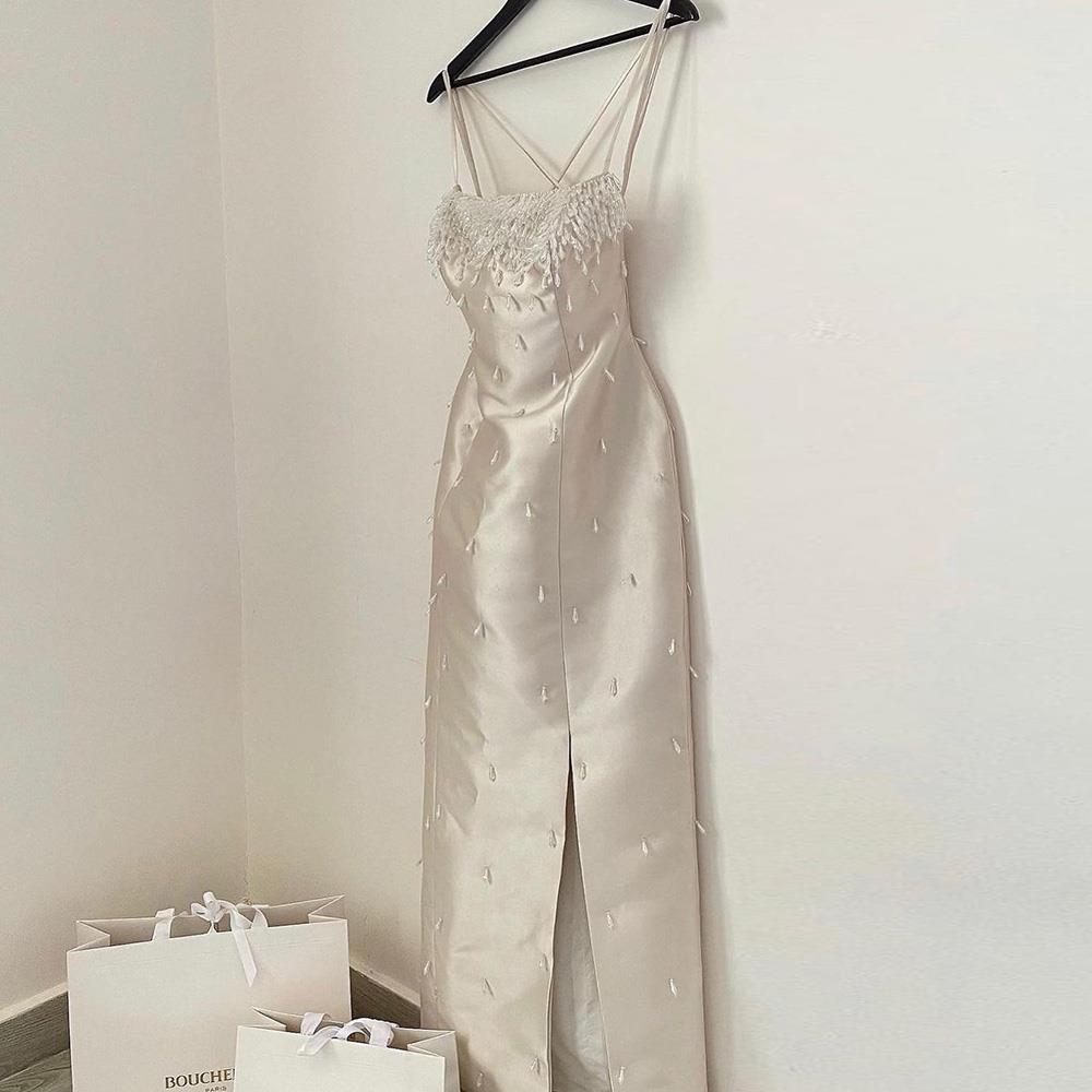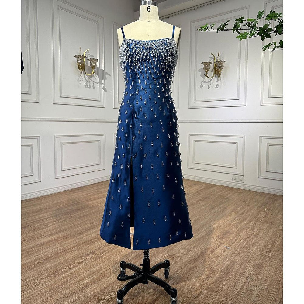 Robe de soirée sirène bleue sexy à bretelles spaghetti et col bateau, ornée de perles, luxueuse robe arabe pour femme, LA71788