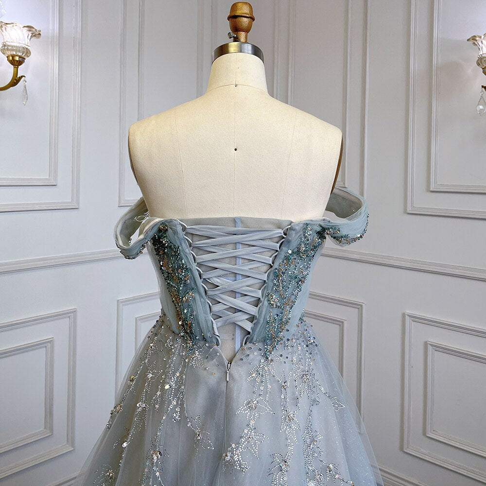 Robe de soirée luxueuse à perles, coupe trapèze, bleu et gris, avec jupe à bretelles et manches courtes, pour femme, LA71740