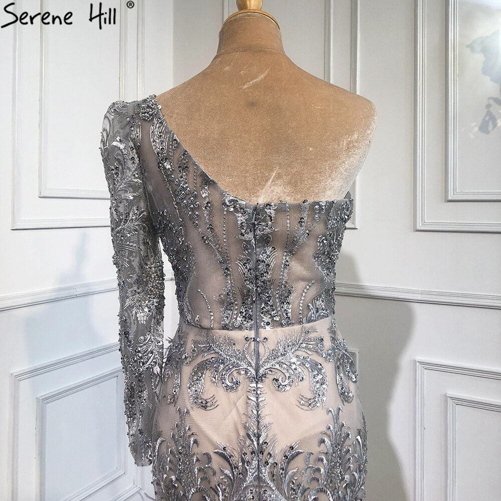 Robe de soirée sirène grise sexy à fente haute, asymétrique, avec perles et plumes, modèle LA70691, 2025