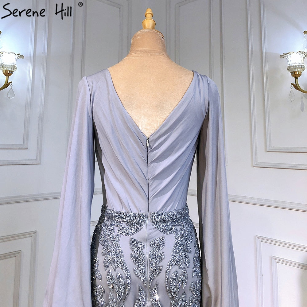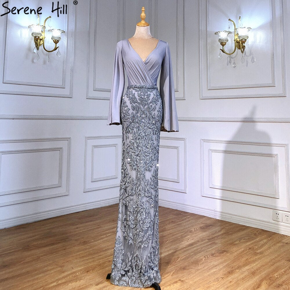 Robe de soirée sirène grise de luxe, élégante, manches lanternes perlées, pour femme, LA71484