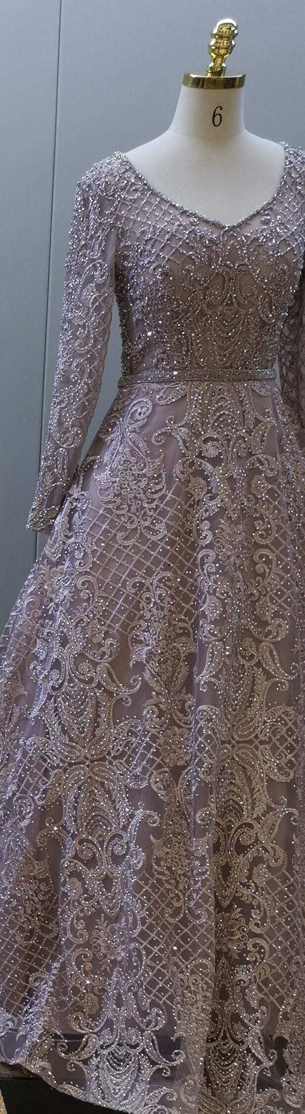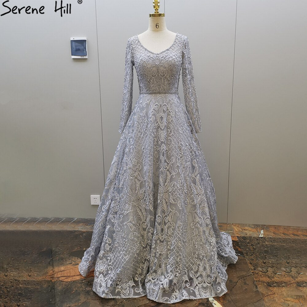 Robe de soirée longue grise en dentelle et perles pour femme, style musulman, coupe trapèze, luxueuse, modèle LA71472, 2025